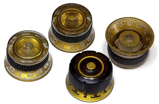 1978年パーツ・カタログでは、大アップの写真が表紙を飾った「ノンスリップ・ラバー付きノブ(KN610)」。これはグレコ・オリジナル・モデルの特徴的な部品で、ゴールドと黒がある。さらに細かくみると刻字部分が太い物(左)と細い物(後)があり、時代的には前者の方が古い。細字タイプの物では、背面に「IBANEZ」とブランド名が入っているのがご愛敬。無くなりやすい部品で、ラバーも劣化して切れやすい傾向が否めないが、この部品には独特の趣がある。もちろん現在ではパーツとしての入手は不可能だ。そこでアイバニーズのシュアグリップllノブを、GO用にアレンジしてみた。単に内側から金色に塗装しただけだが、他のどのノブよりGOに似合うと思っている(GOlllDSで使用中)。近年のギターで、ピービーのスティーブ・クロッパー型ギターについているノブも良さそうなのだが、そちらはなんと1500円(1個)の売値。グレコ・オリジナルギターでは、補修部品が手に入らない点が泣き所になっている。 |